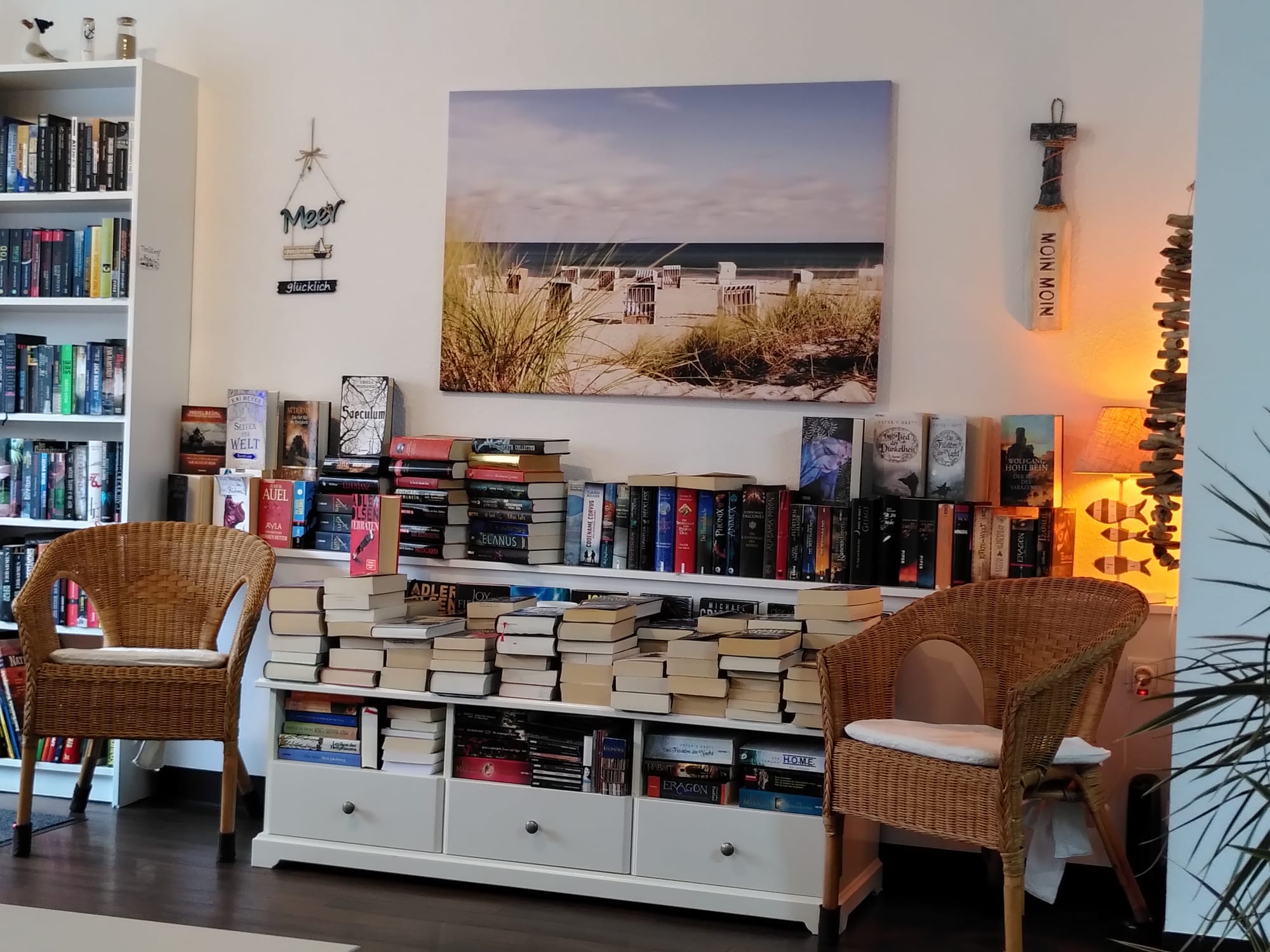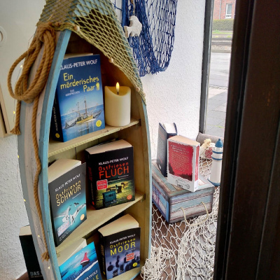 Im gemütlichen Second-Hand-Buchladen mit Nordsee-Flair finden Krimi-Liebhaber u.a. ein gutes Angebot an Ostfriesenkrimis von Klaus-Peter Wolf und anderen Autorinnen und Autoren.